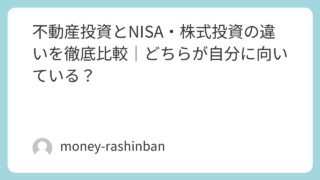 不動産投資 不動産投資とNISA・株式投資の違いを徹底比較|どちらが自分に向いている? 不動産投資とNISA・株式投資の違いを徹底比較。リターン・リスク・手間・税制・向いている人の特徴まで詳しく解説。資産形成の方法で迷っている方必見です。 2026.04.22 不動産投資