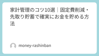 家計管理 家計管理のコツ10選|固定費削減・先取り貯蓄で確実にお金を貯める方法 家計管理の基本から固定費削減・先取り貯蓄まで初心者向けに解説。今日からできる節約術10選と家計管理アプリの活用法もわかりやすく紹介します。 2026.04.21 家計管理